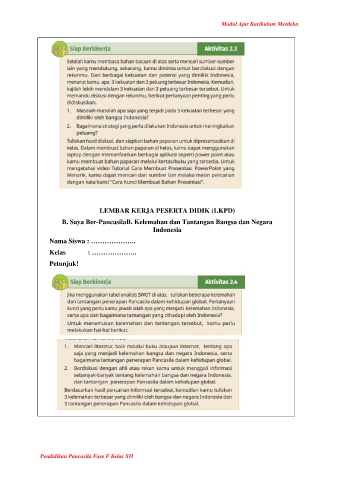 Modul Ajar Kurikulum Merdeka LEMBAR KERJA PESERTA DIDIK (LKPD) B. Saya Ber-PancasilaB. Kelemahan dan Tantangan Bangsa dan Negara Indonesia Nama Siswa : ……………….. Kelas : ……………….. Petunjuk! Pendidikan Pancasila Fase F Kelas XII