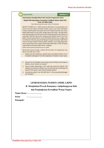 Modul Ajar Kurikulum Merdeka LEMBAR KERJA PESERTA DIDIK (LKPD) B. Menginisiasi Proyek Kampanye Antipelanggaran Hak dan Pengingkaran Kewajiban Warga Negara Nama Siswa : ……………….. Kelas : ……………….. Petunjuk! Pendidikan Pancasila Fase F Kelas XII
