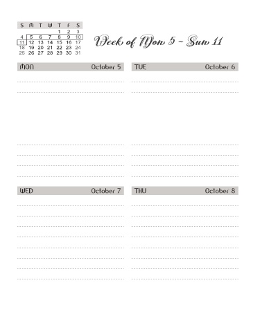 S M T W T F S 1 2 3 4 5 6 7 8 9 10 11 12 13 14 15 16 17 Week of Mon 5 ~ Sun 11 18 19 20 21 22 23 24 25 26 27 28 29 30 31 MON October 5 TUE October 6 WED October 7 THU October 8