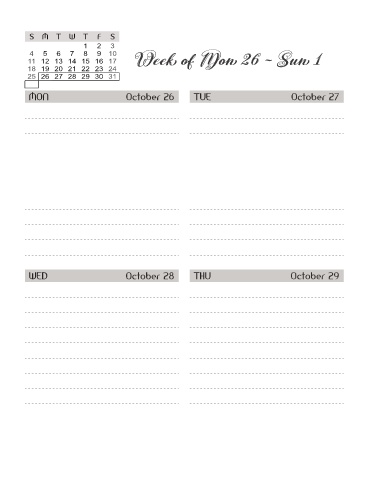 S M T W T F S 1 2 3 4 5 6 7 8 9 10 11 12 13 14 15 16 17 Week of Mon 26 ~ Sun 1 18 19 20 21 22 23 24 25 26 27 28 29 30 31 MON October 26 TUE October 27 WED October 28 THU October 29