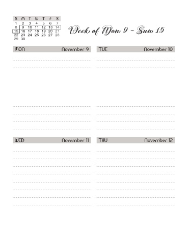 S M T W T F S 1 2 3 4 5 6 7 8 9 10 11 12 13 14 15 16 17 18 19 20 21 Week of Mon 9 ~ Sun 15 22 23 24 25 26 27 28 29 30 MON November 9 TUE November 10 WED November 11 THU November 12