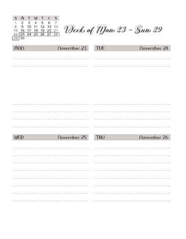 S M T W T F S 1 2 3 4 5 6 7 8 9 10 11 12 13 14 15 16 17 18 19 20 21 Week of Mon 23 ~ Sun 29 22 23 24 25 26 27 28 29 30 MON November 23 TUE November 24 WED November 25 THU November 26