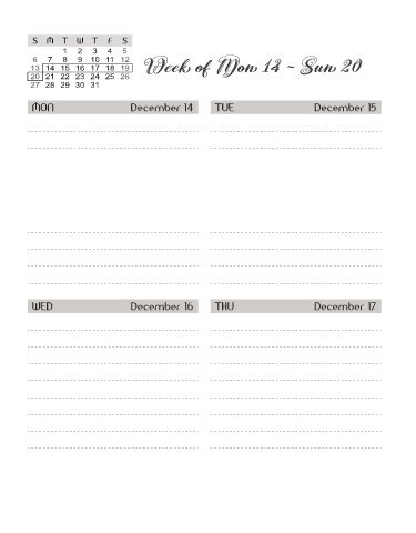 S M T W T F S 1 2 3 4 5 6 7 8 9 10 11 12 13 14 15 16 17 18 19 Week of Mon 14 ~ Sun 20 20 21 22 23 24 25 26 27 28 29 30 31 MON December 14 TUE December 15 WED December 16 THU December 17