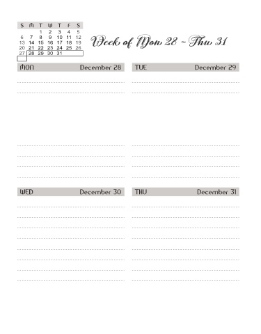 S M T W T F S 1 2 3 4 5 6 7 8 9 10 11 12 13 14 15 16 17 18 19 Week of Mon 28 ~ Thu 31 20 21 22 23 24 25 26 27 28 29 30 31 MON December 28 TUE December 29 WED December 30 THU December 31