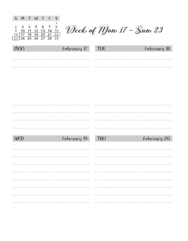 S M T W T F S 1 2 3 4 5 6 7 8 9 10 11 12 13 14 15 Week of Mon 17 ~ Sun 23 16 17 18 19 20 21 22 23 24 25 26 27 28 29 MON February 17 TUE February 18 WED February 19 THU February 20