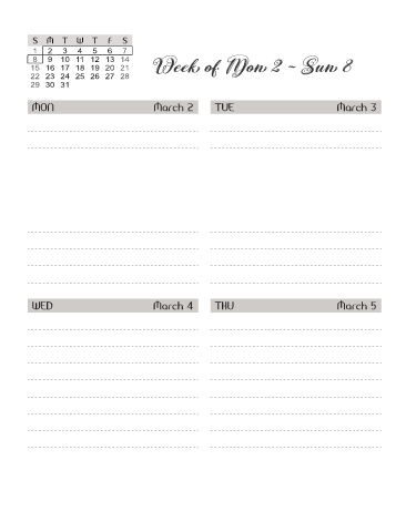 S M T W T F S 1 2 3 4 5 6 7 8 9 10 11 12 13 14 15 16 17 18 19 20 21 Week of Mon 2 ~ Sun 8 22 23 24 25 26 27 28 29 30 31 MON March 2 TUE March 3 WED March 4 THU March 5