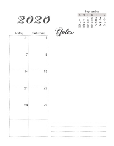 September S M T W T F S 2020 13 14 15 16 17 18 19 1 5 4 3 2 9 10 11 12 8 7 6 20 21 22 23 24 25 26 27 28 29 30 Notes Friday Saturday
