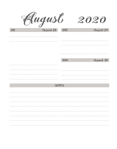 August 2020 FRI August 28 SAT August 29 SUN August 30 NOTES