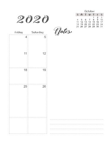 October S M T W T F S 2020 11 12 13 14 15 16 17 3 2 1 8 7 10 9 4 5 6 18 19 20 21 22 23 24 25 26 27 28 29 30 31 Notes Friday Saturday