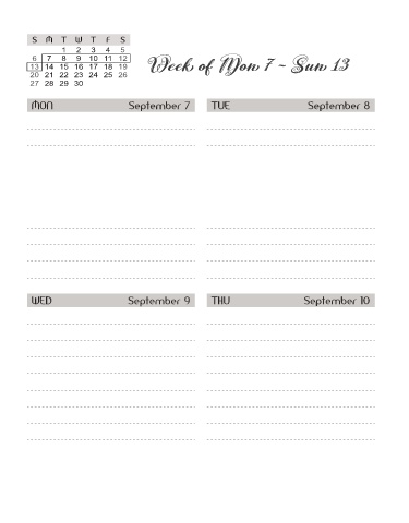 S M T W T F S 1 2 3 4 5 6 7 8 9 10 11 12 13 14 15 16 17 18 19 Week of Mon 7 ~ Sun 13 20 21 22 23 24 25 26 27 28 29 30 MON September 7 TUE September 8 WED September 9 THU September 10