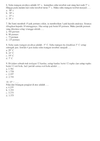 8. Suhu suatu ruangan awalnya adalah –5° C. Suhu ruangan itu dinaikkan 3° C setiap