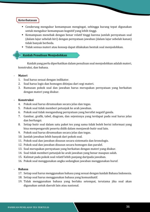 Kaidah yang perlu diperhatikan dalam penulisan soal menjodohkan adalah materi,