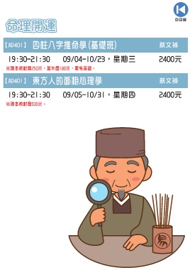 命理開運 回目錄 命理開運 【AD401】 四柱八字推命學(基礎班) 蔡文禎 19:30-21:30 09/04-10/23,星期三 2400元 ※課本教材費250元,萬年曆180元,需有基礎。 【AD401】 東方人的面相心理學 蔡文禎 19:30-21:30 09/05-10/31,星期四 2400元 ※課本教材費500元。