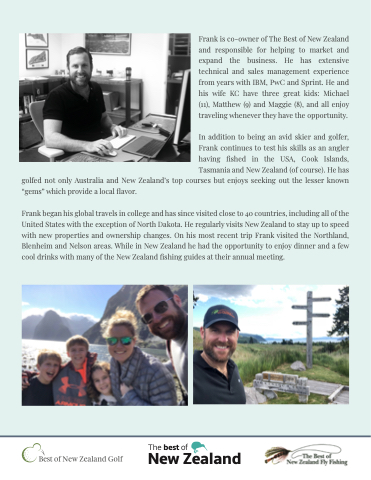 Frank is co-owner of The Best of New Zealand and responsible for helping to market and expand the business. He has extensive technical and sales management experience from years with IBM, PwC and Sprint. He and his wife KC have three great kids: Michael (11), Matthew (9) and Maggie (8), and all enjoy traveling whenever they have the opportunity.