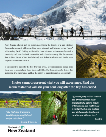 “If you are going to New Zealand and are interested in really getting into the natural beauty of the country, you simply need to contact Best of New Zealand and let them make this the best vacation you will ever take.”