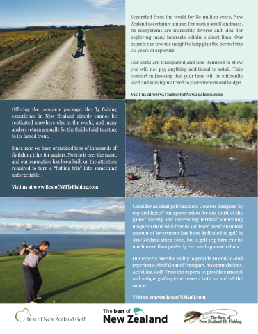 Consider an ideal golf vacation: Courses designed by top architects? An appreciation for the spirit of the game? Variety and interesting terrain? Something unique to share with friends and loved ones? An untold amount of investment has been dedicated to golf in New Zealand since 2000, but a golf trip here can be much more than perfectly executed approach shots.