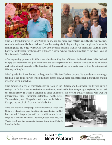 After organizing groups to fly fish in the Himalayan Kingdom of Bhutan in the mid-80’s, Mike decided in 1989 to concentrate solely on organizing and booking travel to New Zealand. However, Mike still visits and fishes almost annually in the Kingdom of Bhutan and has now made over 30 trips to this ancient Himalayan Kingdom.