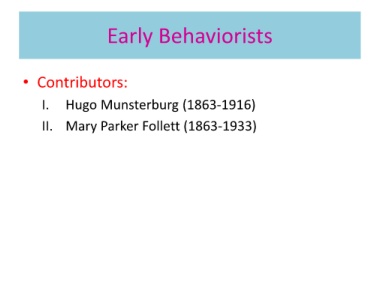 Early Behaviorists • Contributors: I. Hugo Munsterburg (1863-1916) II. Mary Parker Follett (1863-1933)