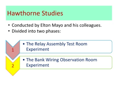 Hawthorne Studies • Conducted by Elton Mayo and his colleagues. • Divided into two phases: • The Relay Assembly Test Room 1 Experiment • The Bank Wiring Observation Room 2 Experiment
