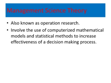 Management Science Theory • Also known as operation research. • Involve the use of computerized mathematical models and statistical methods to increase effectiveness of a decision making process.