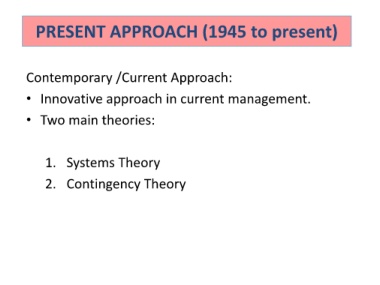 PRESENT APPROACH (1945 to present) Contemporary /Current Approach: • Innovative approach in current management. • Two main theories: 1. Systems Theory 2. Contingency Theory