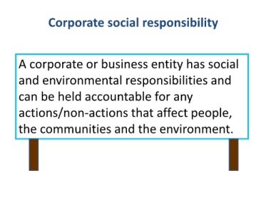 Corporate social responsibility A corporate or business entity has social and environmental responsibilities and can be held accountable for any actions/non-actions that affect people, the communities and the environment.