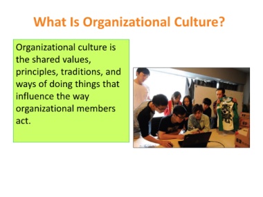What Is Organizational Culture? Organizational culture is the shared values, principles, traditions, and ways of doing things that influence the way organizational members act.