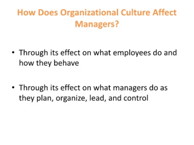 How Does Organizational Culture Affect Managers? • Through its effect on what employees do and how they behave • Through its effect on what managers do as they plan, organize, lead, and control