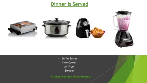 Dinner Is Served • Buffet Server • Slow Cooker • Air Fryer • Blender Pricing Provided Upon Request