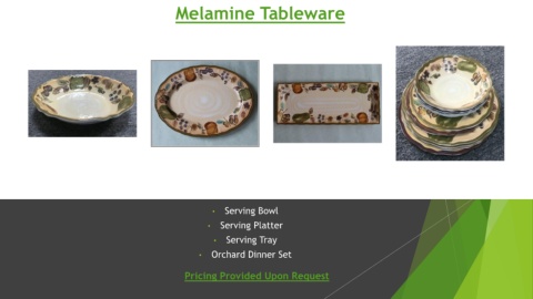 Melamine Tableware • Serving Bowl • Serving Platter • Serving Tray • Orchard Dinner Set Pricing Provided Upon Request