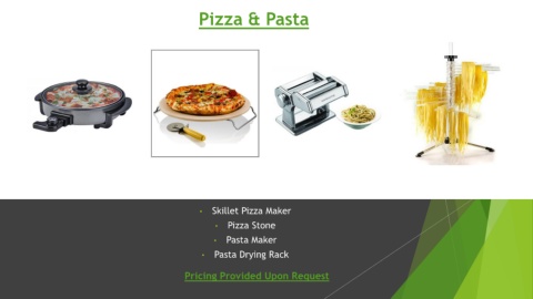 Pizza & Pasta • Skillet Pizza Maker • Pizza Stone • Pasta Maker • Pasta Drying Rack Pricing Provided Upon Request