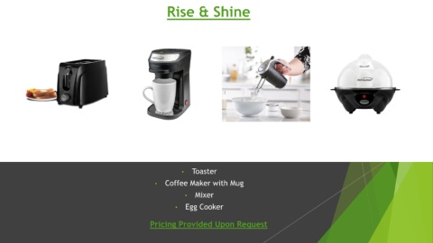 Rise & Shine • Toaster • Coffee Maker with Mug • Mixer • Egg Cooker Pricing Provided Upon Request