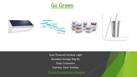 Go Green • Solar Powered Outdoor Light • Reusable Storage Bag Kit • Glass Containers • Stainless Steel Tumbler Pricing Provided Upon Request