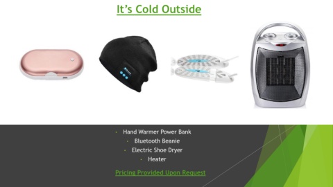 It’s Cold Outside • Hand Warmer Power Bank • Bluetooth Beanie • Electric Shoe Dryer • Heater Pricing Provided Upon Request