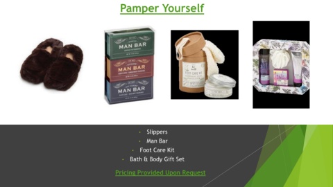 Pamper Yourself • Slippers • Man Bar • Foot Care Kit • Bath & Body Gift Set Pricing Provided Upon Request