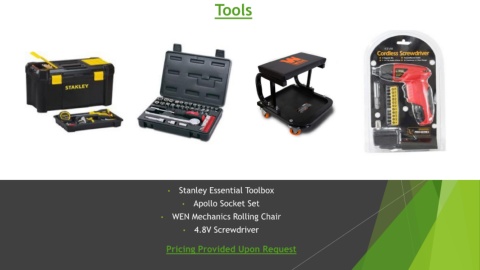 Tools • Stanley Essential Toolbox • Apollo Socket Set • WEN Mechanics Rolling Chair • 4.8V Screwdriver Pricing Provided Upon Request