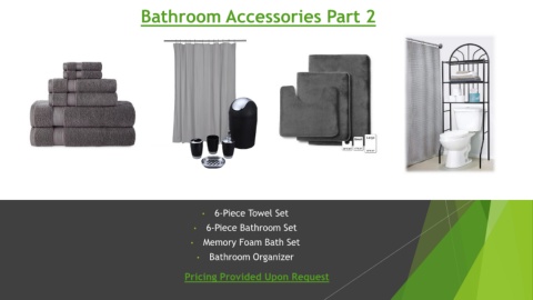 Bathroom Accessories Part 2 • 6-Piece Towel Set • 6-Piece Bathroom Set • Memory Foam Bath Set • Bathroom Organizer Pricing Provided Upon Request