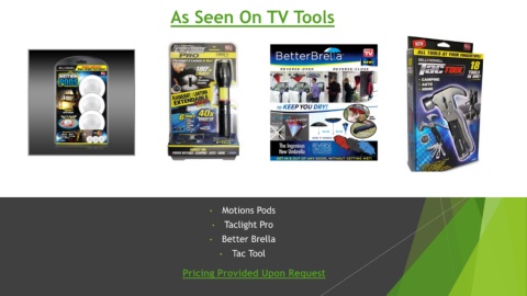 As Seen On TV Tools • Motions Pods • Taclight Pro • Better Brella • Tac Tool Pricing Provided Upon Request