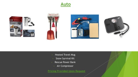 Auto • Heated Travel Mug • Snow Survival Kit • Rescue Power Bank • Air Compressor Pricing Provided Upon Request
