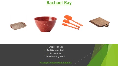 Rachael Ray • Crisper Pan Set • Red Garbage Bowl • Spoonula Set • Wood Cutting Board Pricing Provided Upon Request