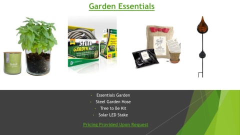 Garden Essentials • Essentials Garden • Steel Garden Hose • Tree to Be Kit • Solar LED Stake Pricing Provided Upon Request