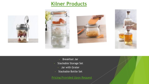 Kilner Products • Breakfast Jar • Stackable Storage Set • Jar with Grater • Stackable Bottle Set Pricing Provided Upon Request