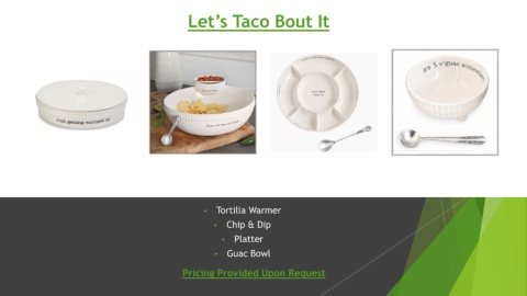 Let’s Taco Bout It • Tortilla Warmer • Chip & Dip • Platter • Guac Bowl Pricing Provided Upon Request