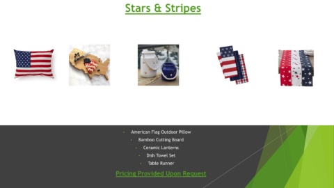 Stars & Stripes • American Flag Outdoor Pillow • Bamboo Cutting Board • Ceramic Lanterns • Dish Towel Set • Table Runner Pricing Provided Upon Request