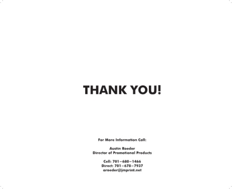 THANK YOU! For More Information Call: Austin Roeder Director of Promotional Products Cell: 701-680-1466 Direct: 701-678-7937 aroeder@jmprint.net