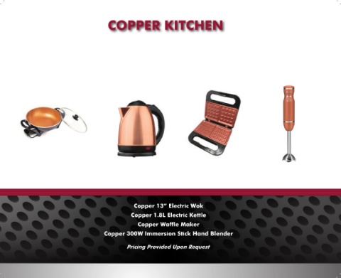 COPPER KITCHEN Copper 13” Electric Wok Copper 1.8L Electric Kettle Copper Waffle Maker Copper 300W Immersion Stick Hand Blender Pricing Provided Upon Request