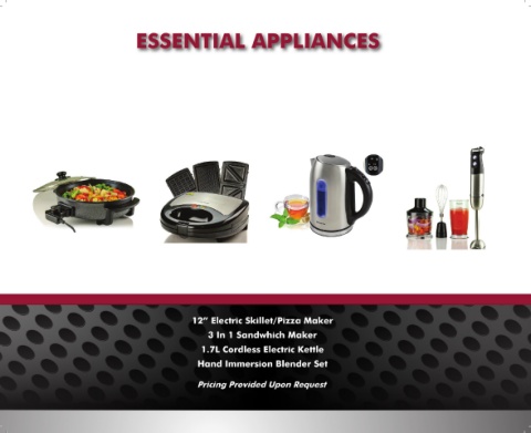 ESSENTIAL APPLIANCES 12” Electric Skillet/Pizza Maker 3 In 1 Sandwhich Maker 1.7L Cordless Electric Kettle Hand Immersion Blender Set Pricing Provided Upon Request