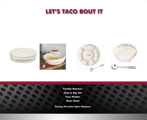 LET’S TACO BOUT IT Tortilla Warmer Chip & Dip Set Taco Platter Guac Bowl Pricing Provided Upon Request