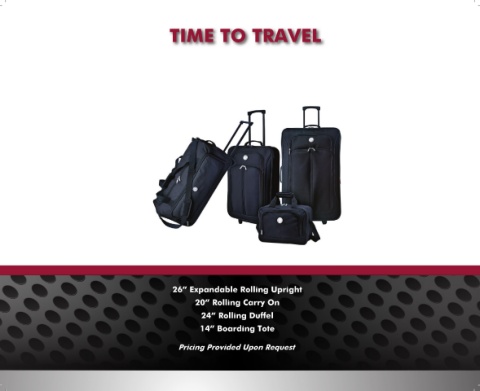 TIME TO TRAVEL 26” Expandable Rolling Upright 20” Rolling Carry On 24” Rolling Duffel 14” Boarding Tote Pricing Provided Upon Request