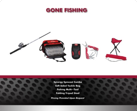GONE FISHING Synergy Spincast Combo Soft Sided Tackle Bag Fishing Multi-Tool Folding Tripod Stool Pricing Provided Upon Request